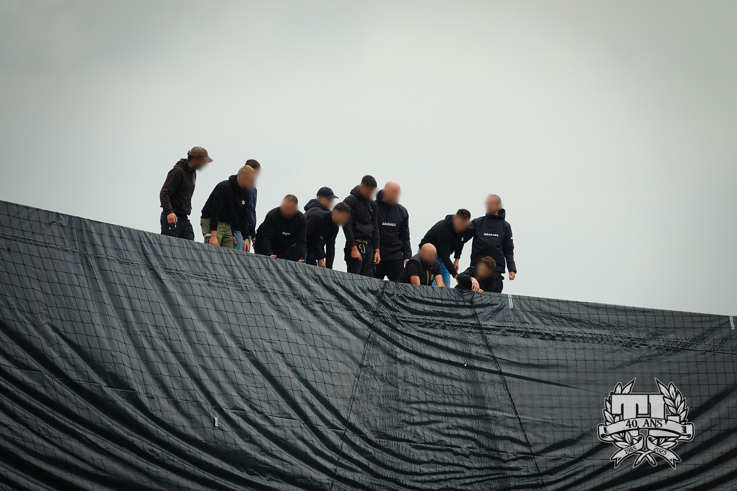 Malheureusement, les conditions météo ne sont pas idéales : le vent souffle fort et complique le déploiement du tifo. Malgré les efforts, il n’est pas hissé aussi haut que prévu et certains détails de la partie basse restent invisibles. Mais l’essentiel est là : le message passe et l’idée est comprise.