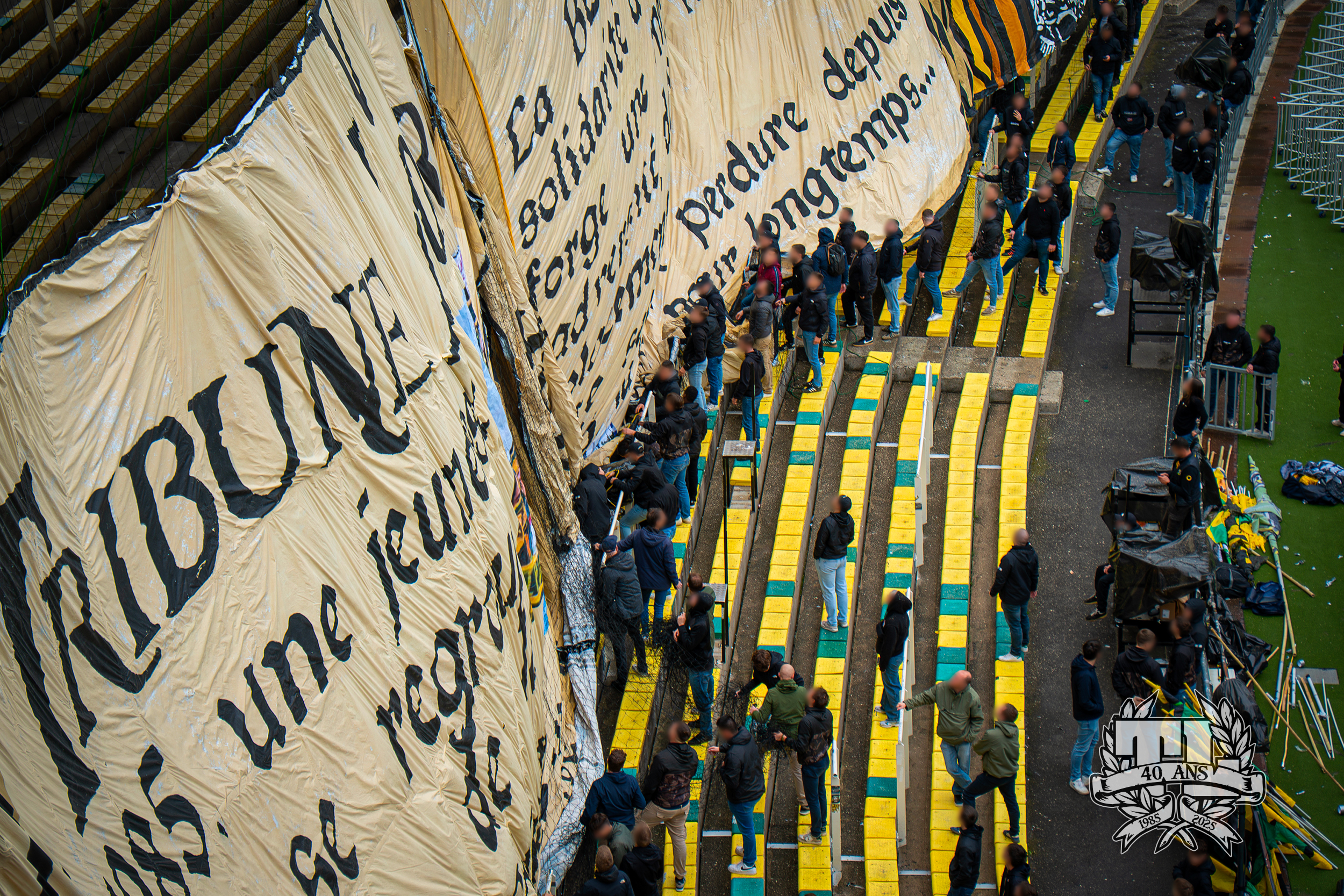 Pour l’occasion, la tribune était surchargée de papelitos, de PQ, de ballons-barre, de drapeaux et d’étendards. Le fond de tribune avait été recouvert de plastique jaune et vert, tandis que des bandes tricolores striaient la Loire. Quelques pots de fumée jaunes et verts, ainsi que quelques torches, venaient compléter le tableau. Sur le devant de la tribune, une banderole « ¡ Dale Dale Nantes FC ! » pour accompagner le tout.