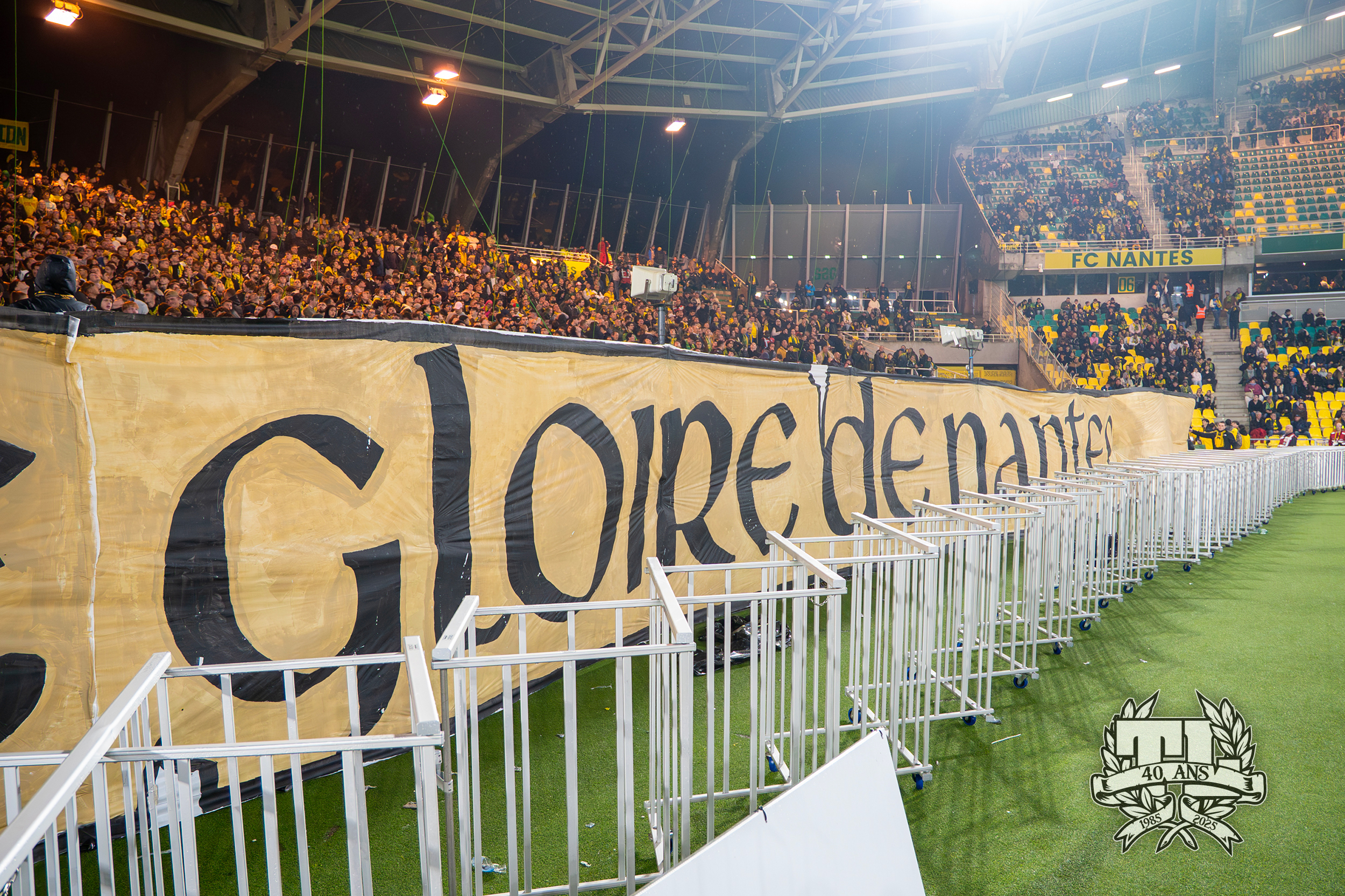 Sur le devant de la tribune, la banderole « Pour la plus grande gloire de Nantes » — devise attachée à la tribune — complète le tifo.