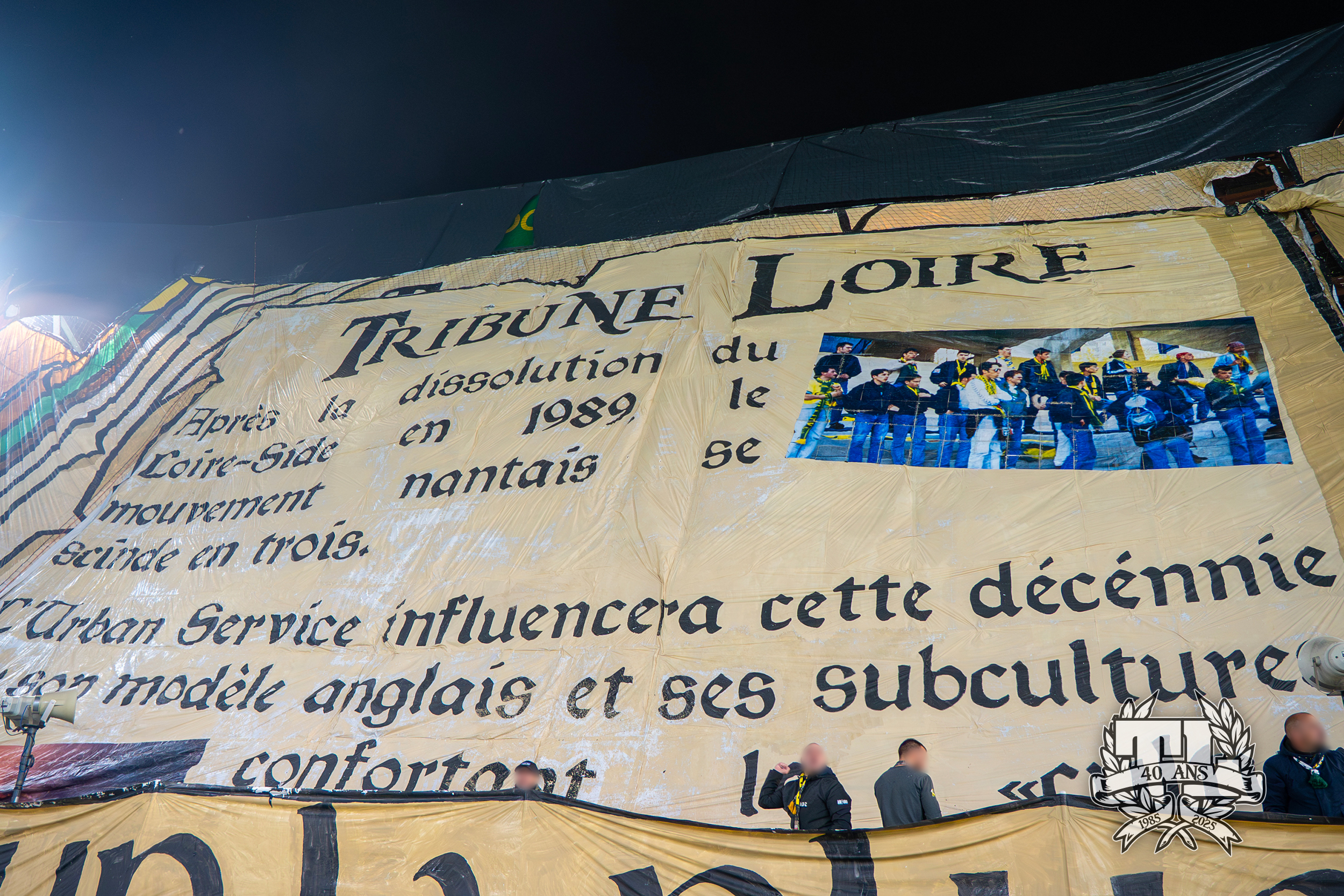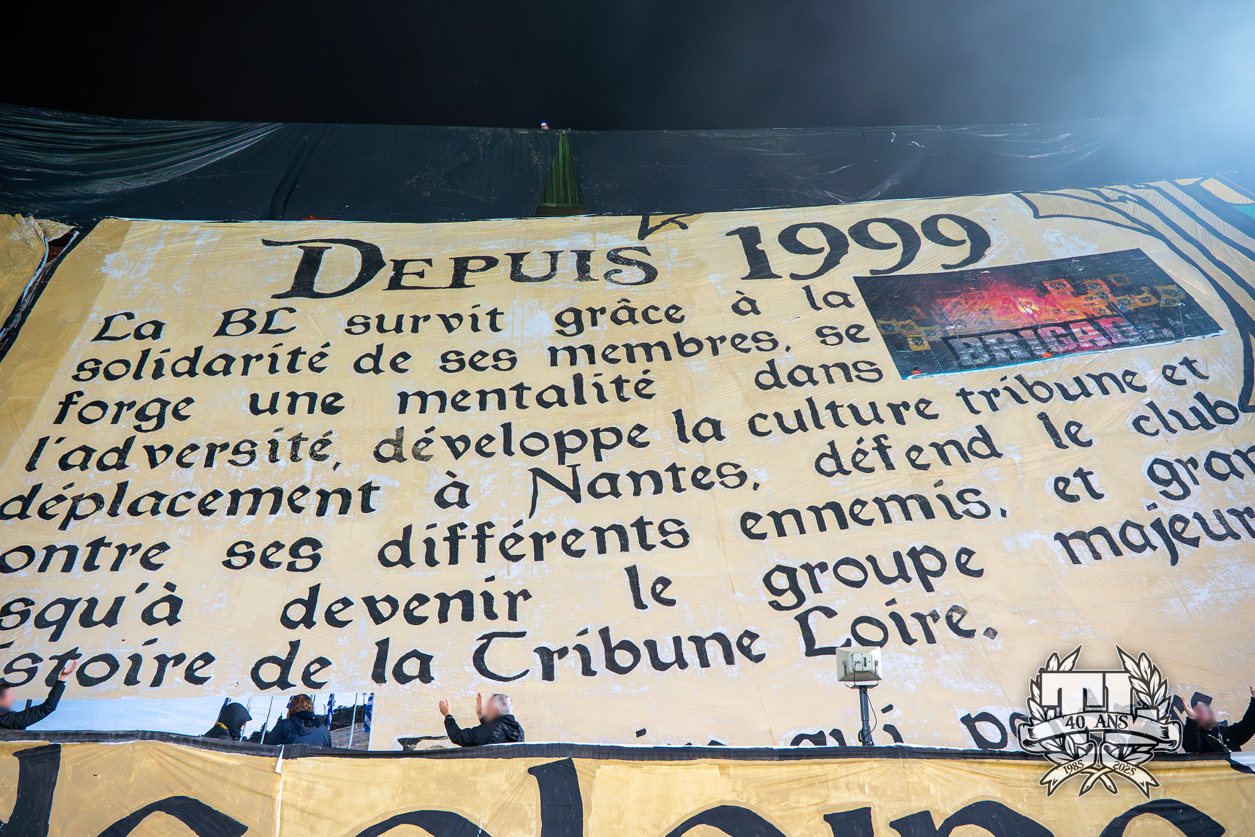 En début de seconde période, une nouvelle voile est hissée, reprenant un large TRIBUNE LOIRE, avec le logo des 40 ans posé au centre, le tout en transparent sur fond noir.