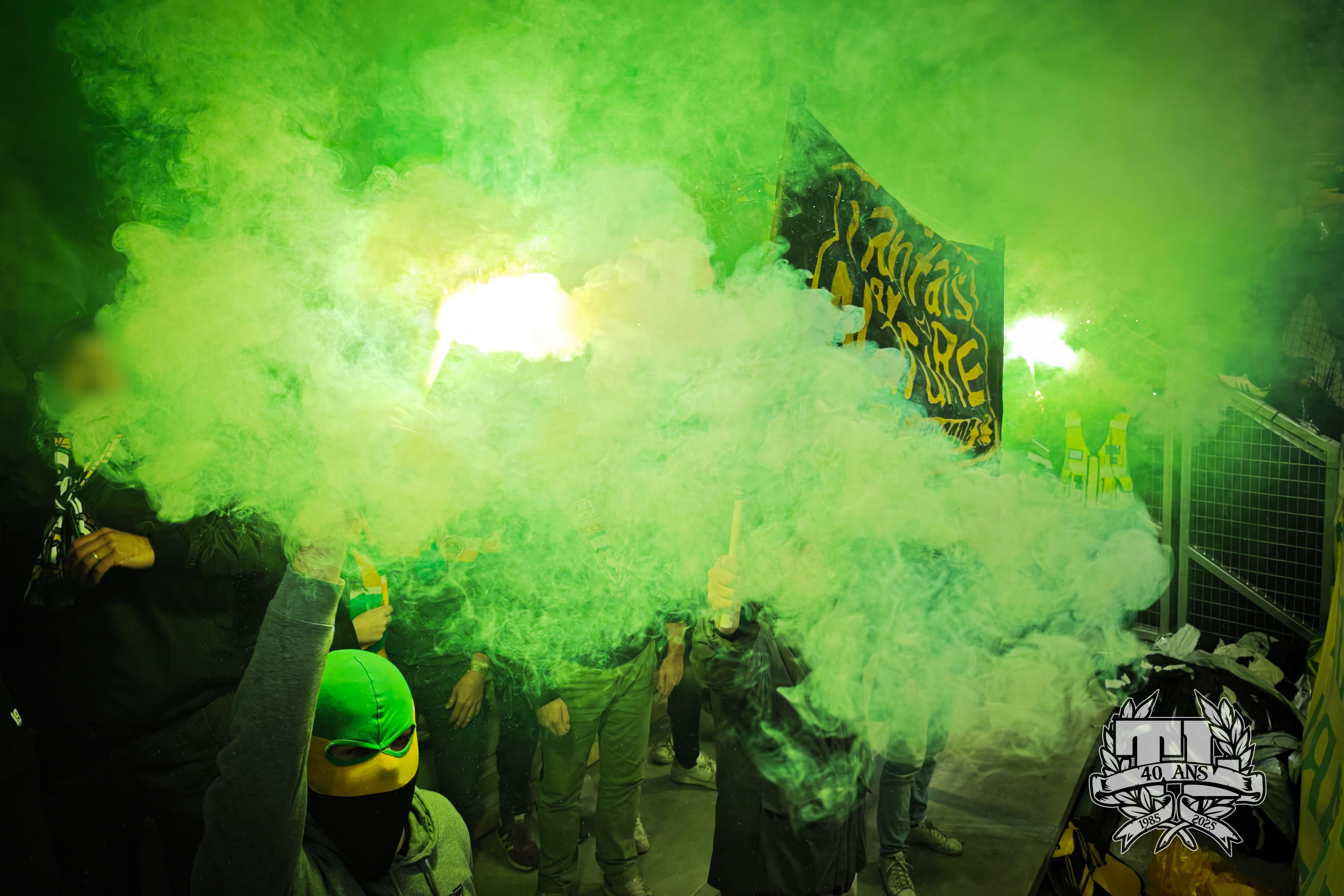 La seconde mi-temps repart timidement en tribune, mais sur le terrain, nos joueurs reviennent avec de meilleures intentions. Petit à petit, l’ambiance suit. Les drapeaux s’agitent, papelitos et PQ refont régulièrement surface. La réduction du score à la 64e minute redonne un vrai souffle à la Loire et à tout le stade.